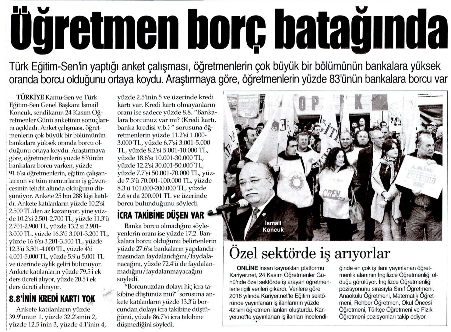 Öğretmen Borç Batağında – 9 Eylül İzmir Basında TES 24 Kasım 2016 FacebookTwitterWhatsAppLinkedin A- A A+ Son Haberler Haberler IRAK TÜRKMEN EĞİTİMCİLERİNDEN GENEL BAŞKAN TALİP GEYLAN’A ANLAMLI ZİYARET Irak Türkmen Eğitimciler Öğretmen Örgütü Başkanı Ali Gülboy ve beraberindeki heyet, 11 Şubat 2026... 11 Şubat 2026 Haberler ÖZEL EĞİTİM ANAOKULLARINDA GÖREV YAPAN ÖZEL EĞİTİM ÖĞRETMENLERİNE DE HAFTADA 1 SAAT EK DERS... 11 Şubat 2026 Haberler TÜRK EĞİTİM SEN ÜYELERİNE;MEB EKYS 2026 YAZILI SINAVINA HAZIRLIK DUYURUSU 2026 yılı Millî Eğitim Bakanlığı Eğitim Kurumlarına Yönetici Seçme Sınavı (MEB EKYS) kapsamında uygulanacak... 10 Şubat 2026 Tüm Haberler NORM FAZLASI RE’SEN ATAMADA YÜRÜTMEYİ DURDURMA KARARI Sendikamız üyesinin, norm kadro fazlası olduğu gerekçesiyle re’sen, aile birliği mazeretine uygun olmayan bir... 10 Şubat 2026
