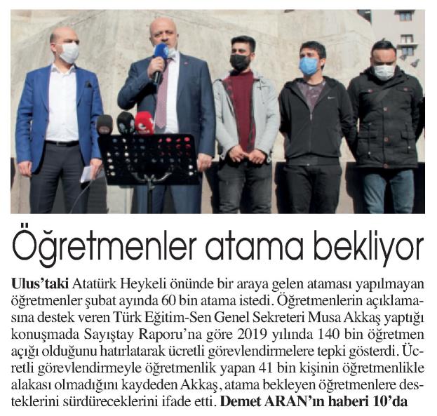 Öğretmenler Atama Bekliyor – Anayurt Basında TES 10 Şubat 2021 FacebookTwitterWhatsAppLinkedin A- A A+ Son Haberler Haberler YÖNETİCİ GÖREVLENDİRME YÖNETMELİĞİNE DAVA AÇTIK Türk Eğitim Sen, 30.01.2026 tarih ve 33153 sayılı resmi gazete yayımlanan Milli Eğitim Bakanlığı... 12 Şubat 2026 Haberler IRAK TÜRKMEN EĞİTİMCİLERİNDEN GENEL BAŞKAN TALİP GEYLAN’A ANLAMLI ZİYARET Irak Türkmen Eğitimciler Öğretmen Örgütü Başkanı Ali Gülboy ve beraberindeki heyet, 11 Şubat 2026... 11 Şubat 2026 Haberler ÖZEL EĞİTİM ANAOKULLARINDA GÖREV YAPAN ÖZEL EĞİTİM ÖĞRETMENLERİNE DE HAFTADA 1 SAAT EK DERS... 11 Şubat 2026 Haberler TÜRK EĞİTİM SEN ÜYELERİNE;MEB EKYS 2026 YAZILI SINAVINA HAZIRLIK DUYURUSU 2026 yılı Millî Eğitim Bakanlığı Eğitim Kurumlarına Yönetici Seçme Sınavı (MEB EKYS) kapsamında uygulanacak... 10 Şubat 2026