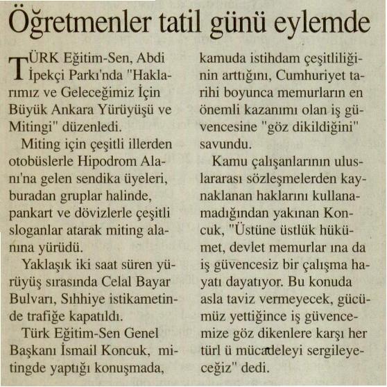 Öğretmenler Tatil Günü Eylemde – Bizim Gazete Basında TES 15 Mart 2010 FacebookTwitterWhatsAppLinkedin A- A A+ Son Haberler Tüm Haberler NORM FAZLASI RE’SEN ATAMADA YENİ BİR YÜRÜTMEYİ DURDURMA KARARI Sendikamız üyesinin, norm kadro fazlası olduğu gerekçesiyle re’sen, aile birliği mazeretine uygun olmayan bir... 17 Şubat 2026 Haberler GENEL BAŞKAN TALİP GEYLAN GÜVEN TAZELEDİ 15 Şubat 2026 tarihinde Ankara’da yapılan Türk Eğitim-Sen 8. Olağan Merkez Genel Kurulu'nda mevcut... 15 Şubat 2026 Haberler 8. OLAĞAN MERKEZ GENEL KURULUMUZ COŞKU İLE GERÇEKLEŞTİ Türk Eğitim Sen 8. Olağan Merkez Genel Kurulu, 15 Şubat 2026 tarihinde Ankara’da coşku... 15 Şubat 2026 Haberler YÖNETİCİ GÖREVLENDİRME YÖNETMELİĞİNE DAVA AÇTIK Türk Eğitim Sen, 30.01.2026 tarih ve 33153 sayılı resmi gazete yayımlanan Milli Eğitim Bakanlığı... 12 Şubat 2026