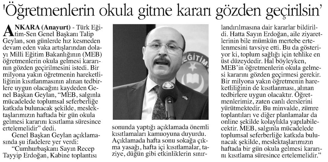 Öğretmenlerin Okula Gitme Kararı Gözden Geçirilsin – Anayurt Basında TES 2 Aralık 2020 FacebookTwitterWhatsAppLinkedin A- A A+ Son Haberler Haberler YÖNETİCİ GÖREVLENDİRME YÖNETMELİĞİNE DAVA AÇTIK Türk Eğitim Sen, 30.01.2026 tarih ve 33153 sayılı resmi gazete yayımlanan Milli Eğitim Bakanlığı... 12 Şubat 2026 Haberler IRAK TÜRKMEN EĞİTİMCİLERİNDEN GENEL BAŞKAN TALİP GEYLAN’A ANLAMLI ZİYARET Irak Türkmen Eğitimciler Öğretmen Örgütü Başkanı Ali Gülboy ve beraberindeki heyet, 11 Şubat 2026... 11 Şubat 2026 Haberler ÖZEL EĞİTİM ANAOKULLARINDA GÖREV YAPAN ÖZEL EĞİTİM ÖĞRETMENLERİNE DE HAFTADA 1 SAAT EK DERS... 11 Şubat 2026 Haberler TÜRK EĞİTİM SEN ÜYELERİNE;MEB EKYS 2026 YAZILI SINAVINA HAZIRLIK DUYURUSU 2026 yılı Millî Eğitim Bakanlığı Eğitim Kurumlarına Yönetici Seçme Sınavı (MEB EKYS) kapsamında uygulanacak... 10 Şubat 2026