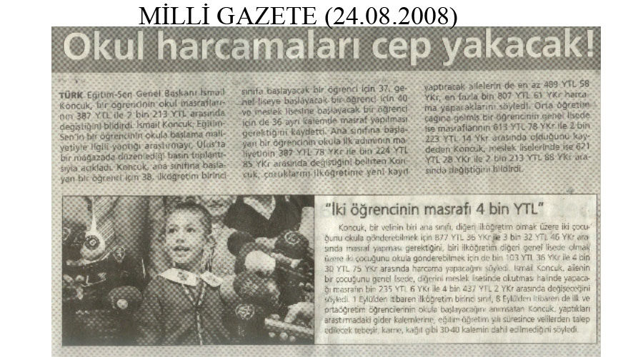 Okul Harcamaları Cep Yakacak – Milligazete Basında TES 24 Ağustos 2008 FacebookTwitterWhatsAppLinkedin A- A A+ Son Haberler Haberler YÖNETİCİ GÖREVLENDİRME YÖNETMELİĞİNE DAVA AÇTIK Türk Eğitim Sen, 30.01.2026 tarih ve 33153 sayılı resmi gazete yayımlanan Milli Eğitim Bakanlığı... 12 Şubat 2026 Haberler IRAK TÜRKMEN EĞİTİMCİLERİNDEN GENEL BAŞKAN TALİP GEYLAN’A ANLAMLI ZİYARET Irak Türkmen Eğitimciler Öğretmen Örgütü Başkanı Ali Gülboy ve beraberindeki heyet, 11 Şubat 2026... 11 Şubat 2026 Haberler ÖZEL EĞİTİM ANAOKULLARINDA GÖREV YAPAN ÖZEL EĞİTİM ÖĞRETMENLERİNE DE HAFTADA 1 SAAT EK DERS... 11 Şubat 2026 Haberler TÜRK EĞİTİM SEN ÜYELERİNE;MEB EKYS 2026 YAZILI SINAVINA HAZIRLIK DUYURUSU 2026 yılı Millî Eğitim Bakanlığı Eğitim Kurumlarına Yönetici Seçme Sınavı (MEB EKYS) kapsamında uygulanacak... 10 Şubat 2026