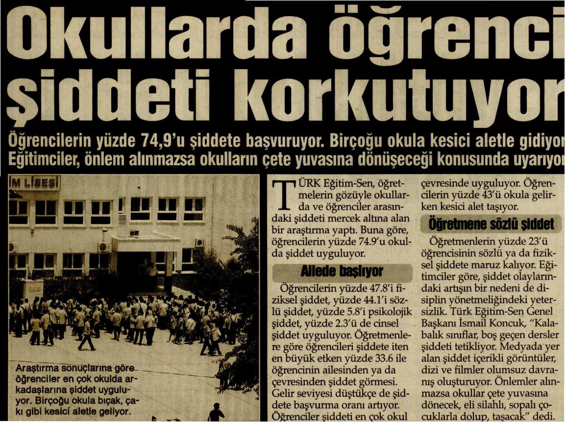 Okullarda Öğrenci Şiddeti Korkutuyor – Sözcü Basında TES 18 Mayıs 2009 FacebookTwitterWhatsAppLinkedin A- A A+ Son Haberler Haberler YÖNETİCİ GÖREVLENDİRME YÖNETMELİĞİNE DAVA AÇTIK Türk Eğitim Sen, 30.01.2026 tarih ve 33153 sayılı resmi gazete yayımlanan Milli Eğitim Bakanlığı... 12 Şubat 2026 Haberler IRAK TÜRKMEN EĞİTİMCİLERİNDEN GENEL BAŞKAN TALİP GEYLAN’A ANLAMLI ZİYARET Irak Türkmen Eğitimciler Öğretmen Örgütü Başkanı Ali Gülboy ve beraberindeki heyet, 11 Şubat 2026... 11 Şubat 2026 Haberler ÖZEL EĞİTİM ANAOKULLARINDA GÖREV YAPAN ÖZEL EĞİTİM ÖĞRETMENLERİNE DE HAFTADA 1 SAAT EK DERS... 11 Şubat 2026 Haberler TÜRK EĞİTİM SEN ÜYELERİNE;MEB EKYS 2026 YAZILI SINAVINA HAZIRLIK DUYURUSU 2026 yılı Millî Eğitim Bakanlığı Eğitim Kurumlarına Yönetici Seçme Sınavı (MEB EKYS) kapsamında uygulanacak... 10 Şubat 2026