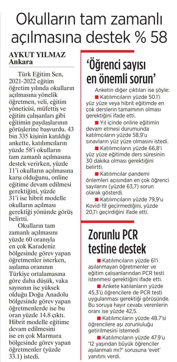 Okulların Tam Zamanlı Açılmasına Destek %58 – Milliyet Basında TES 2 Eylül 2021 FacebookTwitterWhatsAppLinkedin A- A A+ Son Haberler Haberler GELİŞİM RAPORLARININ YIL SONUNDA VERİLMESİ KONUSUNDA MEB İVEDİLİKLE RESMİ BİR AÇIKLAMA YAPMALIDIR Türk Eğitim-Sen Genel Merkezi tarafından; öğretmenlerimizin üzerinde giderek artan gereksiz kırtasiyecilik ve angarya iş... 9 Ocak 2026 Haberler HİÇ KİMSE ZORLA ÇALIŞTIRILAMAZ! Milli Eğitim Bakanlığı tarafından "Türkiye Yüzyılı Maarif Modeli" kapsamında uygulamaya konulan öğrenci gelişim raporlarıyla... 8 Ocak 2026 Haberler PROJE OKULLARI KEYFİ ATAMALARLA YÖNETİLEMEZ! Genel Başkanımız Talip Geylan, proje okullarındaki yönetici ve öğretmen atamalarına ilişkin bir açıklama yaparak, ... 8 Ocak 2026 Tüm Haberler 2025 YILI ÇALIŞMA HAYATI VE 2026 YILI BEKLENTİLER” BASIN TOPLANTIMIZI GERÇEKLEŞTİRDİK 2025 yılı çalışma hayatı ve 2026 yılına dair beklenti ve taleplerimizi kamuoyu ile paylaştığımız... 6 Ocak 2026