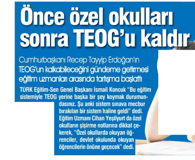 Önce Özel Okulları Sonra TEOG`u Kaldır – Aydınlık Basında TES 17 Eylül 2017 FacebookTwitterWhatsAppLinkedin A- A A+ Son Haberler Haberler TÜRK DÜNYASINDA EĞİTİM ALANINDA İŞBİRLİĞİ SÜRÜYOR Türk Eğitim-Sen ve Uluslararası Avrasya Eğitim Sendikaları Birliği Genel Başkanı Talip Geylan ile Kırgızistan... 19 Şubat 2026 Tüm Haberler NORM FAZLASI RE’SEN ATAMADA YENİ BİR YÜRÜTMEYİ DURDURMA KARARI Sendikamız üyesinin, norm kadro fazlası olduğu gerekçesiyle re’sen, aile birliği mazeretine uygun olmayan bir... 17 Şubat 2026 Haberler GENEL BAŞKAN TALİP GEYLAN GÜVEN TAZELEDİ 15 Şubat 2026 tarihinde Ankara’da yapılan Türk Eğitim-Sen 8. Olağan Merkez Genel Kurulu'nda mevcut... 15 Şubat 2026 Haberler 8. OLAĞAN MERKEZ GENEL KURULUMUZ COŞKU İLE GERÇEKLEŞTİ Türk Eğitim Sen 8. Olağan Merkez Genel Kurulu, 15 Şubat 2026 tarihinde Ankara’da coşku... 15 Şubat 2026