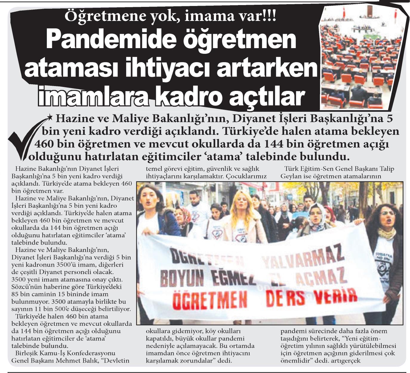Pandemide Öğretmen Ataması İhtiyacı Artarken İmamlara Kadro Açtılar – Gaziantep Sabah Basında TES 21 Ağustos 2020 FacebookTwitterWhatsAppLinkedin A- A A+ Son Haberler Haberler YÖNETİCİ GÖREVLENDİRME YÖNETMELİĞİNE DAVA AÇTIK Türk Eğitim Sen, 30.01.2026 tarih ve 33153 sayılı resmi gazete yayımlanan Milli Eğitim Bakanlığı... 12 Şubat 2026 Haberler IRAK TÜRKMEN EĞİTİMCİLERİNDEN GENEL BAŞKAN TALİP GEYLAN’A ANLAMLI ZİYARET Irak Türkmen Eğitimciler Öğretmen Örgütü Başkanı Ali Gülboy ve beraberindeki heyet, 11 Şubat 2026... 11 Şubat 2026 Haberler ÖZEL EĞİTİM ANAOKULLARINDA GÖREV YAPAN ÖZEL EĞİTİM ÖĞRETMENLERİNE DE HAFTADA 1 SAAT EK DERS... 11 Şubat 2026 Haberler TÜRK EĞİTİM SEN ÜYELERİNE;MEB EKYS 2026 YAZILI SINAVINA HAZIRLIK DUYURUSU 2026 yılı Millî Eğitim Bakanlığı Eğitim Kurumlarına Yönetici Seçme Sınavı (MEB EKYS) kapsamında uygulanacak... 10 Şubat 2026