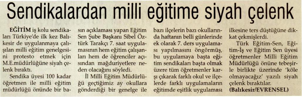 Sendikalardan Milli Eğitime Siyah Çelenk – Günlük Evrensel Basında TES 1 Ocak 2010 FacebookTwitterWhatsAppLinkedin A- A A+ Son Haberler Tüm Haberler NORM FAZLASI RE’SEN ATAMADA YENİ BİR YÜRÜTMEYİ DURDURMA KARARI Sendikamız üyesinin, norm kadro fazlası olduğu gerekçesiyle re’sen, aile birliği mazeretine uygun olmayan bir... 17 Şubat 2026 Haberler GENEL BAŞKAN TALİP GEYLAN GÜVEN TAZELEDİ 15 Şubat 2026 tarihinde Ankara’da yapılan Türk Eğitim-Sen 8. Olağan Merkez Genel Kurulu'nda mevcut... 15 Şubat 2026 Haberler 8. OLAĞAN MERKEZ GENEL KURULUMUZ COŞKU İLE GERÇEKLEŞTİ Türk Eğitim Sen 8. Olağan Merkez Genel Kurulu, 15 Şubat 2026 tarihinde Ankara’da coşku... 15 Şubat 2026 Haberler YÖNETİCİ GÖREVLENDİRME YÖNETMELİĞİNE DAVA AÇTIK Türk Eğitim Sen, 30.01.2026 tarih ve 33153 sayılı resmi gazete yayımlanan Milli Eğitim Bakanlığı... 12 Şubat 2026