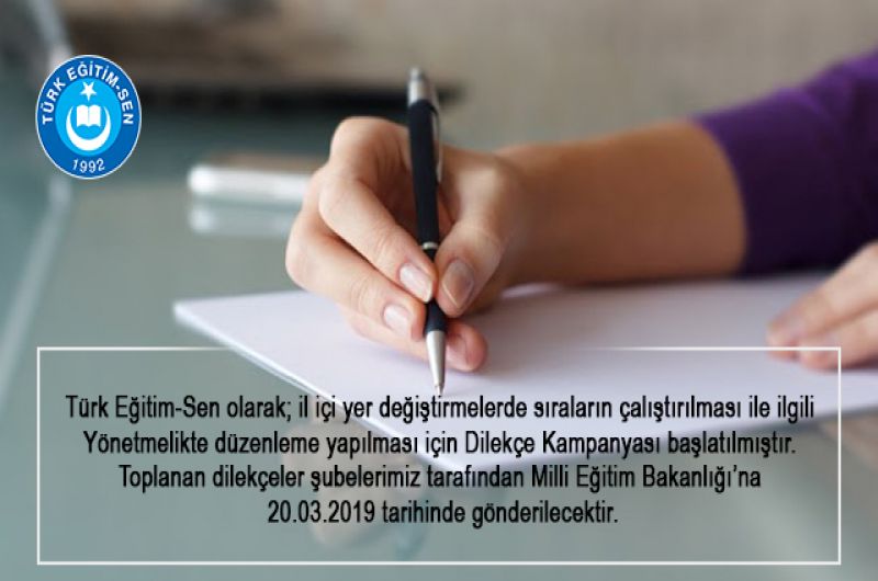 Türk Eğitim-Sen olarak; il içi yer değiştirmelerde sıraların çalıştırılması ile ilgili Yönetmelikte düzenleme yapılması için Dilekçe Kampanyası başlatılmıştır. Toplanan dilekçeler şubelerimiz tarafından Milli Eğitim Bakanlığı’na 20.03.2019 tarihinde gönderilecektir.