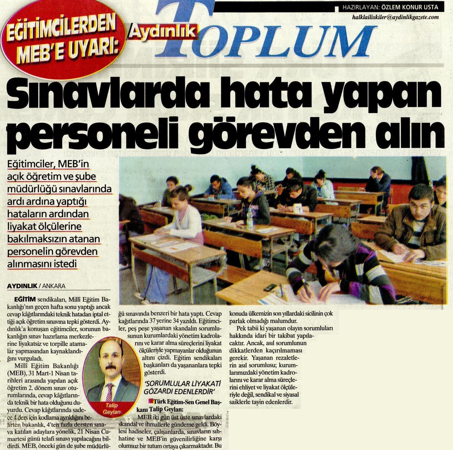 Sorumlular Hata Yapan Personeli Görevden Alın – Aydınlık Basında TES 3 Nisan 2018 FacebookTwitterWhatsAppLinkedin A- A A+ Son Haberler Tüm Haberler NORM FAZLASI RE’SEN ATAMADA YENİ BİR YÜRÜTMEYİ DURDURMA KARARI Sendikamız üyesinin, norm kadro fazlası olduğu gerekçesiyle re’sen, aile birliği mazeretine uygun olmayan bir... 17 Şubat 2026 Haberler GENEL BAŞKAN TALİP GEYLAN GÜVEN TAZELEDİ 15 Şubat 2026 tarihinde Ankara’da yapılan Türk Eğitim-Sen 8. Olağan Merkez Genel Kurulu'nda mevcut... 15 Şubat 2026 Haberler 8. OLAĞAN MERKEZ GENEL KURULUMUZ COŞKU İLE GERÇEKLEŞTİ Türk Eğitim Sen 8. Olağan Merkez Genel Kurulu, 15 Şubat 2026 tarihinde Ankara’da coşku... 15 Şubat 2026 Haberler YÖNETİCİ GÖREVLENDİRME YÖNETMELİĞİNE DAVA AÇTIK Türk Eğitim Sen, 30.01.2026 tarih ve 33153 sayılı resmi gazete yayımlanan Milli Eğitim Bakanlığı... 12 Şubat 2026