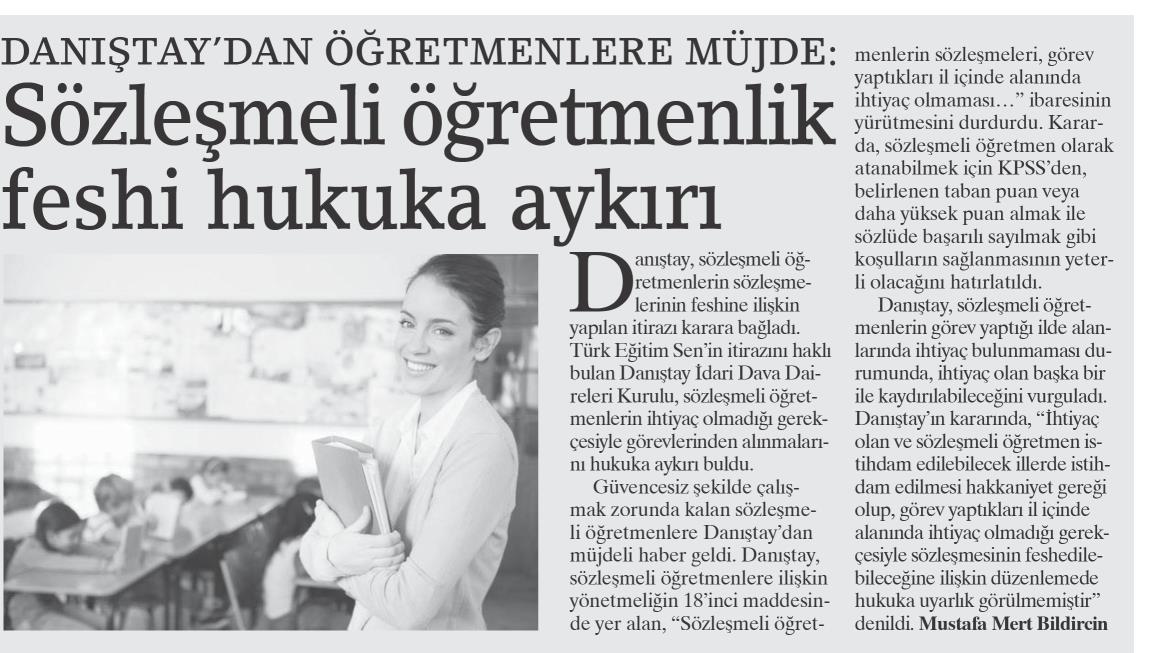 Sözleşmeli Öğretmenlik Feshi Hukuka Aykırı – Birgün Basında TES 20 Mart 2018 FacebookTwitterWhatsAppLinkedin A- A A+ Son Haberler Tüm Haberler NORM FAZLASI RE’SEN ATAMADA YENİ BİR YÜRÜTMEYİ DURDURMA KARARI Sendikamız üyesinin, norm kadro fazlası olduğu gerekçesiyle re’sen, aile birliği mazeretine uygun olmayan bir... 17 Şubat 2026 Haberler GENEL BAŞKAN TALİP GEYLAN GÜVEN TAZELEDİ 15 Şubat 2026 tarihinde Ankara’da yapılan Türk Eğitim-Sen 8. Olağan Merkez Genel Kurulu'nda mevcut... 15 Şubat 2026 Haberler 8. OLAĞAN MERKEZ GENEL KURULUMUZ COŞKU İLE GERÇEKLEŞTİ Türk Eğitim Sen 8. Olağan Merkez Genel Kurulu, 15 Şubat 2026 tarihinde Ankara’da coşku... 15 Şubat 2026 Haberler YÖNETİCİ GÖREVLENDİRME YÖNETMELİĞİNE DAVA AÇTIK Türk Eğitim Sen, 30.01.2026 tarih ve 33153 sayılı resmi gazete yayımlanan Milli Eğitim Bakanlığı... 12 Şubat 2026