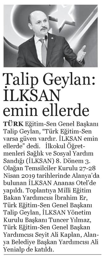 Talip Geylan: İLKSAN Emin Ellerde – Türkgün Basında TES 30 Nisan 2019 FacebookTwitterWhatsAppLinkedin A- A A+ Son Haberler Tüm Haberler NORM FAZLASI RE’SEN ATAMADA YENİ BİR YÜRÜTMEYİ DURDURMA KARARI Sendikamız üyesinin, norm kadro fazlası olduğu gerekçesiyle re’sen, aile birliği mazeretine uygun olmayan bir... 17 Şubat 2026 Haberler GENEL BAŞKAN TALİP GEYLAN GÜVEN TAZELEDİ 15 Şubat 2026 tarihinde Ankara’da yapılan Türk Eğitim-Sen 8. Olağan Merkez Genel Kurulu'nda mevcut... 15 Şubat 2026 Haberler 8. OLAĞAN MERKEZ GENEL KURULUMUZ COŞKU İLE GERÇEKLEŞTİ Türk Eğitim Sen 8. Olağan Merkez Genel Kurulu, 15 Şubat 2026 tarihinde Ankara’da coşku... 15 Şubat 2026 Haberler YÖNETİCİ GÖREVLENDİRME YÖNETMELİĞİNE DAVA AÇTIK Türk Eğitim Sen, 30.01.2026 tarih ve 33153 sayılı resmi gazete yayımlanan Milli Eğitim Bakanlığı... 12 Şubat 2026