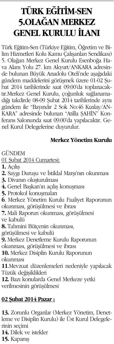 Türk Eğitim-Sen 5.Olağan Merkez Genel Kurulu İlanı – Ortadoğu Basında TES 6 Ocak 2014 FacebookTwitterWhatsAppLinkedin A- A A+ Son Haberler Tüm Haberler NORM FAZLASI RE’SEN ATAMADA YENİ BİR YÜRÜTMEYİ DURDURMA KARARI Sendikamız üyesinin, norm kadro fazlası olduğu gerekçesiyle re’sen, aile birliği mazeretine uygun olmayan bir... 17 Şubat 2026 Haberler GENEL BAŞKAN TALİP GEYLAN GÜVEN TAZELEDİ 15 Şubat 2026 tarihinde Ankara’da yapılan Türk Eğitim-Sen 8. Olağan Merkez Genel Kurulu'nda mevcut... 15 Şubat 2026 Haberler 8. OLAĞAN MERKEZ GENEL KURULUMUZ COŞKU İLE GERÇEKLEŞTİ Türk Eğitim Sen 8. Olağan Merkez Genel Kurulu, 15 Şubat 2026 tarihinde Ankara’da coşku... 15 Şubat 2026 Haberler YÖNETİCİ GÖREVLENDİRME YÖNETMELİĞİNE DAVA AÇTIK Türk Eğitim Sen, 30.01.2026 tarih ve 33153 sayılı resmi gazete yayımlanan Milli Eğitim Bakanlığı... 12 Şubat 2026