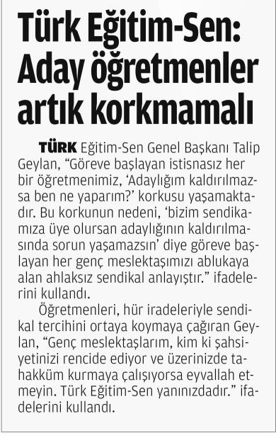 Türk Eğitim-Sen: Aday Öğretmenler Artık Korkmamalı – Milat Basında TES 23 Haziran 2020 FacebookTwitterWhatsAppLinkedin A- A A+ Son Haberler Haberler YÖNETİCİ GÖREVLENDİRME YÖNETMELİĞİNE DAVA AÇTIK Türk Eğitim Sen, 30.01.2026 tarih ve 33153 sayılı resmi gazete yayımlanan Milli Eğitim Bakanlığı... 12 Şubat 2026 Haberler IRAK TÜRKMEN EĞİTİMCİLERİNDEN GENEL BAŞKAN TALİP GEYLAN’A ANLAMLI ZİYARET Irak Türkmen Eğitimciler Öğretmen Örgütü Başkanı Ali Gülboy ve beraberindeki heyet, 11 Şubat 2026... 11 Şubat 2026 Haberler ÖZEL EĞİTİM ANAOKULLARINDA GÖREV YAPAN ÖZEL EĞİTİM ÖĞRETMENLERİNE DE HAFTADA 1 SAAT EK DERS... 11 Şubat 2026 Haberler TÜRK EĞİTİM SEN ÜYELERİNE;MEB EKYS 2026 YAZILI SINAVINA HAZIRLIK DUYURUSU 2026 yılı Millî Eğitim Bakanlığı Eğitim Kurumlarına Yönetici Seçme Sınavı (MEB EKYS) kapsamında uygulanacak... 10 Şubat 2026