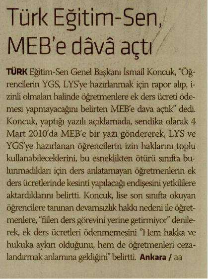 Türk Eğitim-Sen MEB’e Dava Açtı – Yeni Asya