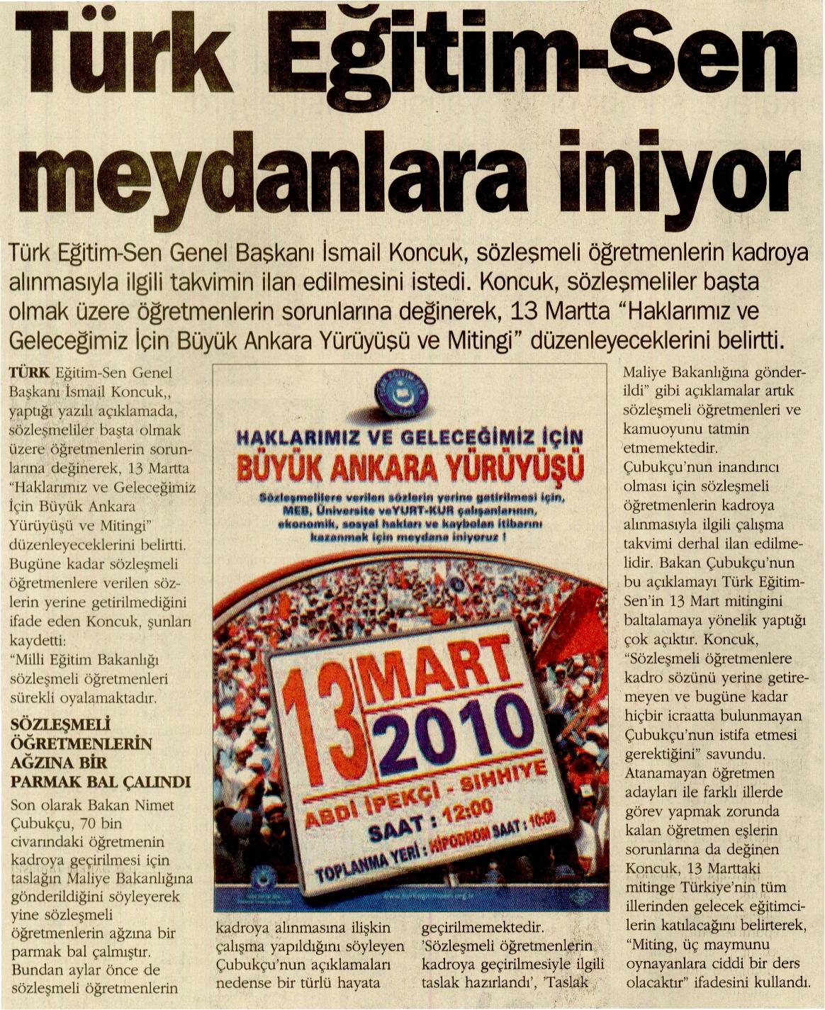 Türk Eğitim-Sen Meydanlara İniyor – Ortadoğu Basında TES 11 Mart 2010 FacebookTwitterWhatsAppLinkedin A- A A+ Son Haberler Tüm Haberler NORM FAZLASI RE’SEN ATAMADA YENİ BİR YÜRÜTMEYİ DURDURMA KARARI Sendikamız üyesinin, norm kadro fazlası olduğu gerekçesiyle re’sen, aile birliği mazeretine uygun olmayan bir... 17 Şubat 2026 Haberler GENEL BAŞKAN TALİP GEYLAN GÜVEN TAZELEDİ 15 Şubat 2026 tarihinde Ankara’da yapılan Türk Eğitim-Sen 8. Olağan Merkez Genel Kurulu'nda mevcut... 15 Şubat 2026 Haberler 8. OLAĞAN MERKEZ GENEL KURULUMUZ COŞKU İLE GERÇEKLEŞTİ Türk Eğitim Sen 8. Olağan Merkez Genel Kurulu, 15 Şubat 2026 tarihinde Ankara’da coşku... 15 Şubat 2026 Haberler YÖNETİCİ GÖREVLENDİRME YÖNETMELİĞİNE DAVA AÇTIK Türk Eğitim Sen, 30.01.2026 tarih ve 33153 sayılı resmi gazete yayımlanan Milli Eğitim Bakanlığı... 12 Şubat 2026