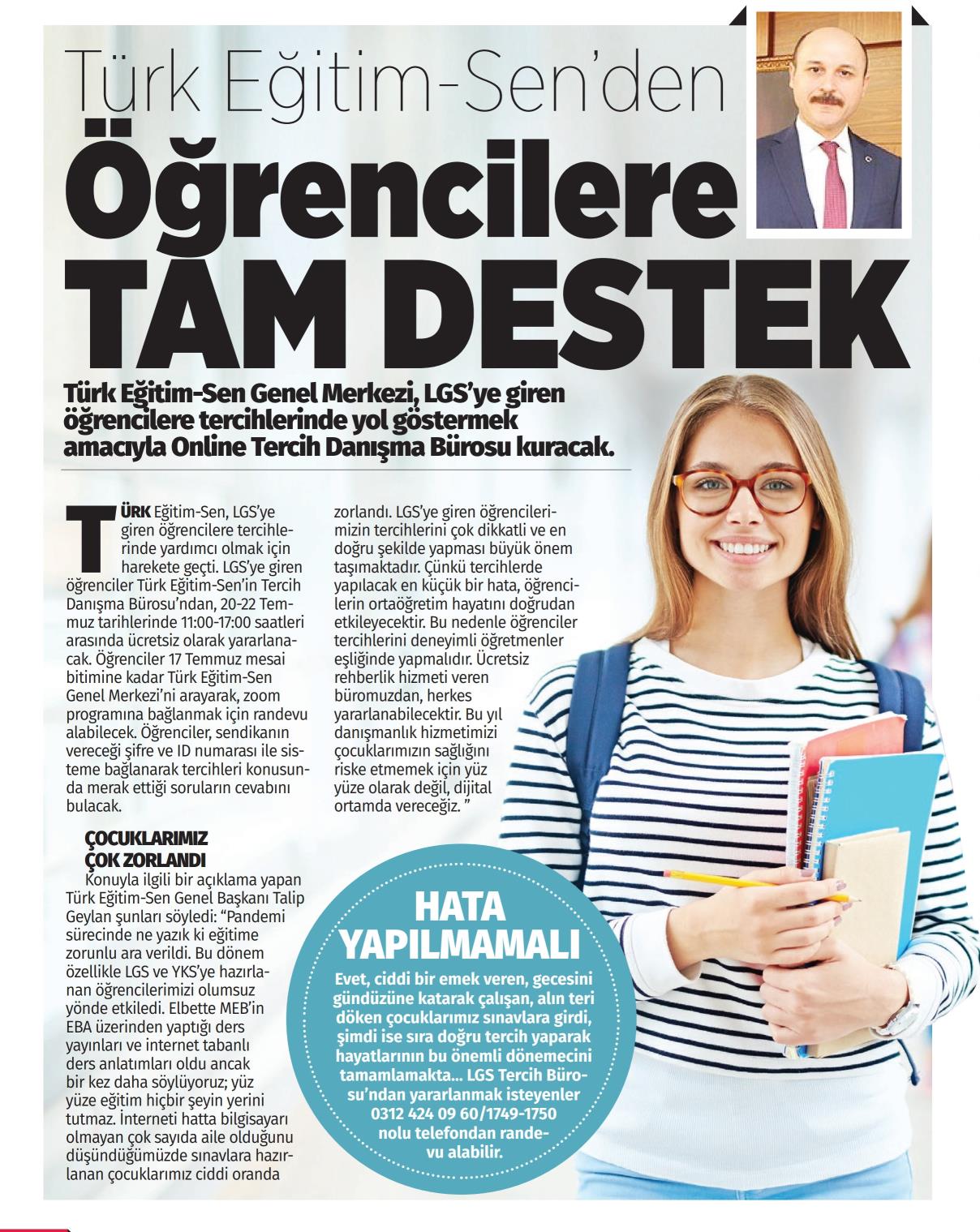 Türk Eğitim-Sen`den Öğrencilere Tam Destek – Türkgün Basında TES 12 Temmuz 2020 FacebookTwitterWhatsAppLinkedin A- A A+ Son Haberler Haberler YÖNETİCİ GÖREVLENDİRME YÖNETMELİĞİNE DAVA AÇTIK Türk Eğitim Sen, 30.01.2026 tarih ve 33153 sayılı resmi gazete yayımlanan Milli Eğitim Bakanlığı... 12 Şubat 2026 Haberler IRAK TÜRKMEN EĞİTİMCİLERİNDEN GENEL BAŞKAN TALİP GEYLAN’A ANLAMLI ZİYARET Irak Türkmen Eğitimciler Öğretmen Örgütü Başkanı Ali Gülboy ve beraberindeki heyet, 11 Şubat 2026... 11 Şubat 2026 Haberler ÖZEL EĞİTİM ANAOKULLARINDA GÖREV YAPAN ÖZEL EĞİTİM ÖĞRETMENLERİNE DE HAFTADA 1 SAAT EK DERS... 11 Şubat 2026 Haberler TÜRK EĞİTİM SEN ÜYELERİNE;MEB EKYS 2026 YAZILI SINAVINA HAZIRLIK DUYURUSU 2026 yılı Millî Eğitim Bakanlığı Eğitim Kurumlarına Yönetici Seçme Sınavı (MEB EKYS) kapsamında uygulanacak... 10 Şubat 2026
