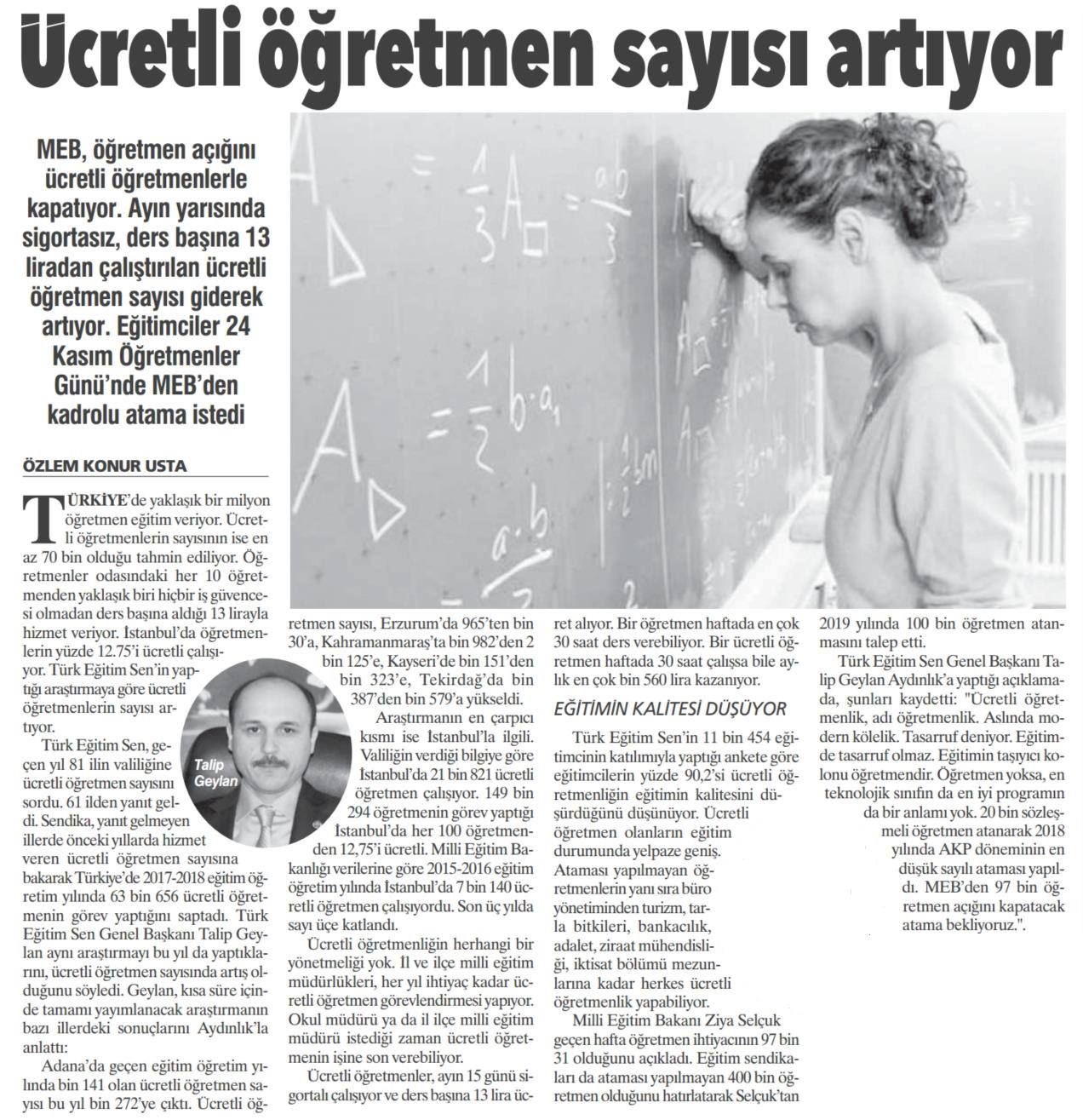 Ücretli Öğretmen Sayısı Artıyor – Aydınlık Basında TES 24 Kasım 2018 FacebookTwitterWhatsAppLinkedin A- A A+ Son Haberler Tüm Haberler NORM FAZLASI RE’SEN ATAMADA YENİ BİR YÜRÜTMEYİ DURDURMA KARARI Sendikamız üyesinin, norm kadro fazlası olduğu gerekçesiyle re’sen, aile birliği mazeretine uygun olmayan bir... 17 Şubat 2026 Haberler GENEL BAŞKAN TALİP GEYLAN GÜVEN TAZELEDİ 15 Şubat 2026 tarihinde Ankara’da yapılan Türk Eğitim-Sen 8. Olağan Merkez Genel Kurulu'nda mevcut... 15 Şubat 2026 Haberler 8. OLAĞAN MERKEZ GENEL KURULUMUZ COŞKU İLE GERÇEKLEŞTİ Türk Eğitim Sen 8. Olağan Merkez Genel Kurulu, 15 Şubat 2026 tarihinde Ankara’da coşku... 15 Şubat 2026 Haberler YÖNETİCİ GÖREVLENDİRME YÖNETMELİĞİNE DAVA AÇTIK Türk Eğitim Sen, 30.01.2026 tarih ve 33153 sayılı resmi gazete yayımlanan Milli Eğitim Bakanlığı... 12 Şubat 2026