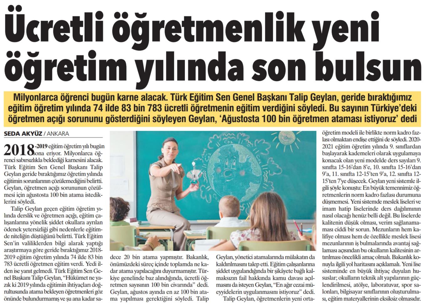 Ücretli Öğretmenlik Yeni Öğretim Yılında Son Bulsun – Aydınlık Basında TES 14 Haziran 2019 FacebookTwitterWhatsAppLinkedin A- A A+ Son Haberler Tüm Haberler NORM FAZLASI RE’SEN ATAMADA YENİ BİR YÜRÜTMEYİ DURDURMA KARARI Sendikamız üyesinin, norm kadro fazlası olduğu gerekçesiyle re’sen, aile birliği mazeretine uygun olmayan bir... 17 Şubat 2026 Haberler GENEL BAŞKAN TALİP GEYLAN GÜVEN TAZELEDİ 15 Şubat 2026 tarihinde Ankara’da yapılan Türk Eğitim-Sen 8. Olağan Merkez Genel Kurulu'nda mevcut... 15 Şubat 2026 Haberler 8. OLAĞAN MERKEZ GENEL KURULUMUZ COŞKU İLE GERÇEKLEŞTİ Türk Eğitim Sen 8. Olağan Merkez Genel Kurulu, 15 Şubat 2026 tarihinde Ankara’da coşku... 15 Şubat 2026 Haberler YÖNETİCİ GÖREVLENDİRME YÖNETMELİĞİNE DAVA AÇTIK Türk Eğitim Sen, 30.01.2026 tarih ve 33153 sayılı resmi gazete yayımlanan Milli Eğitim Bakanlığı... 12 Şubat 2026