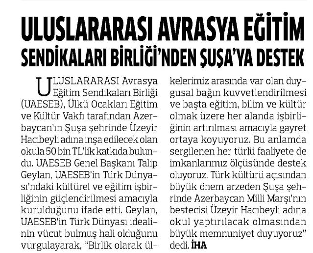 Uluslararası Avrasya Eğitim Sendikaları Birliğinden ŞUŞA`ya Destek – Anadolu