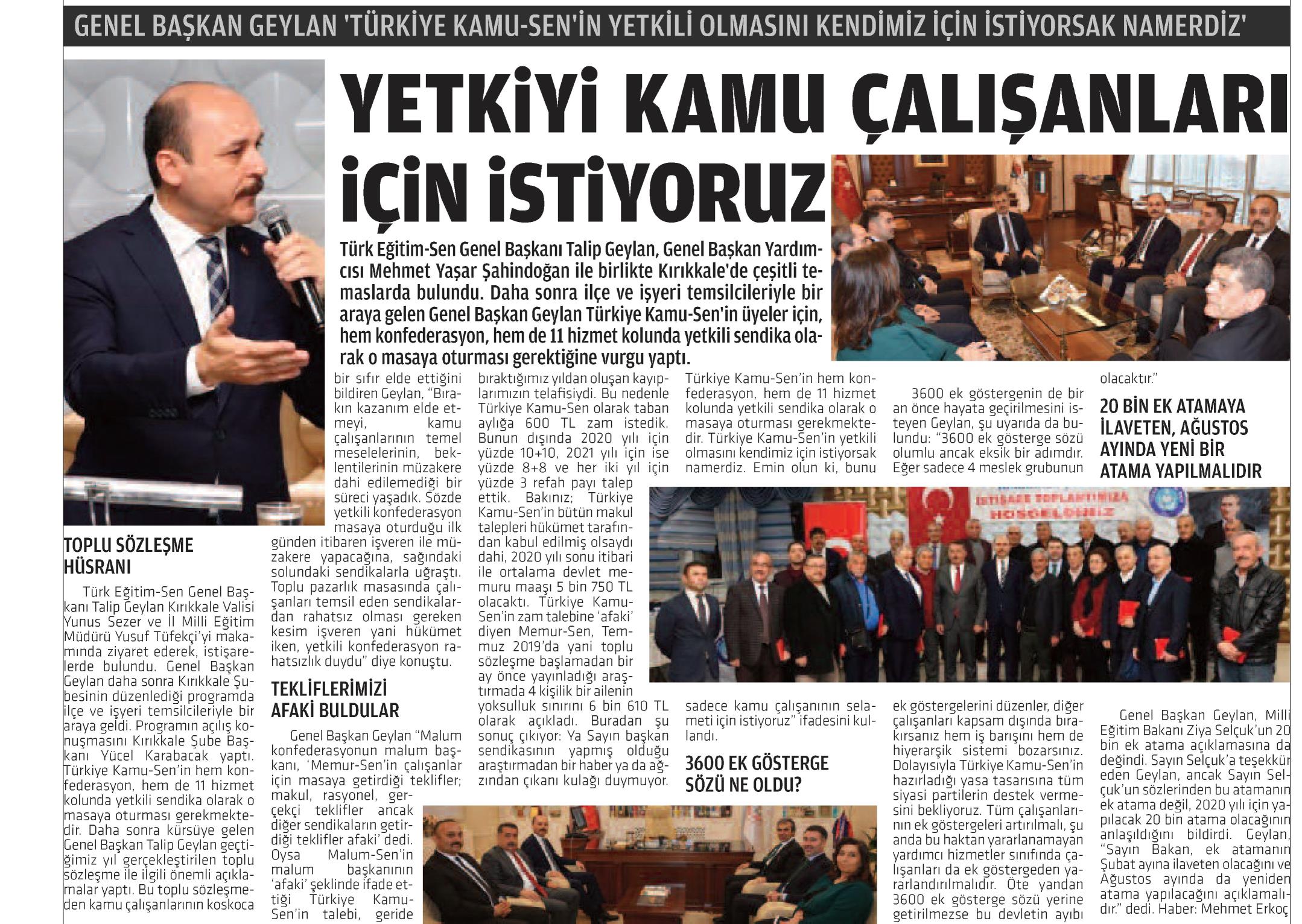Yetkiyi Kamu Çalışanları İçin İstiyoruz – Yenigün Basında TES 24 Şubat 2020 FacebookTwitterWhatsAppLinkedin A- A A+ Son Haberler Haberler GENEL BAŞKAN TALİP GEYLAN GÜVEN TAZELEDİ 15 Şubat 2026 tarihinde Ankara’da yapılan Türk Eğitim-Sen 8. Olağan Merkez Genel Kurulu'nda mevcut... 15 Şubat 2026 Haberler 8. OLAĞAN MERKEZ GENEL KURULUMUZ COŞKU İLE GERÇEKLEŞTİ Türk Eğitim Sen 8. Olağan Merkez Genel Kurulu, 15 Şubat 2026 tarihinde Ankara’da coşku... 15 Şubat 2026 Haberler YÖNETİCİ GÖREVLENDİRME YÖNETMELİĞİNE DAVA AÇTIK Türk Eğitim Sen, 30.01.2026 tarih ve 33153 sayılı resmi gazete yayımlanan Milli Eğitim Bakanlığı... 12 Şubat 2026 Haberler IRAK TÜRKMEN EĞİTİMCİLERİNDEN GENEL BAŞKAN TALİP GEYLAN’A ANLAMLI ZİYARET Irak Türkmen Eğitimciler Öğretmen Örgütü Başkanı Ali Gülboy ve beraberindeki heyet, 11 Şubat 2026... 11 Şubat 2026